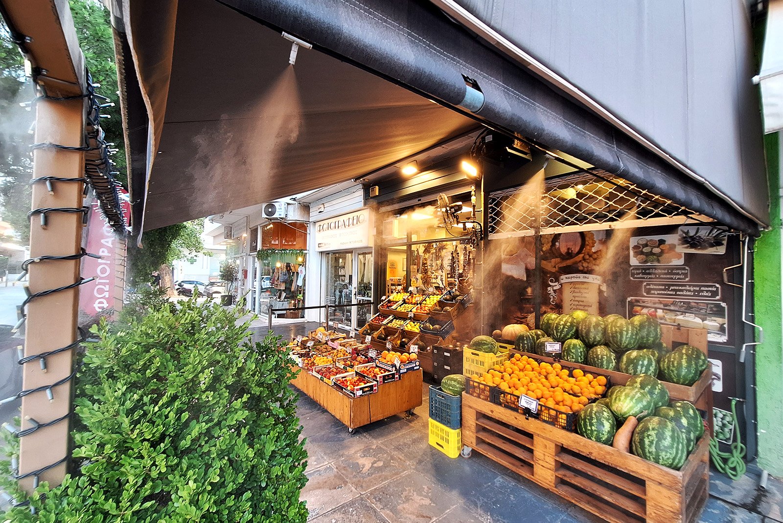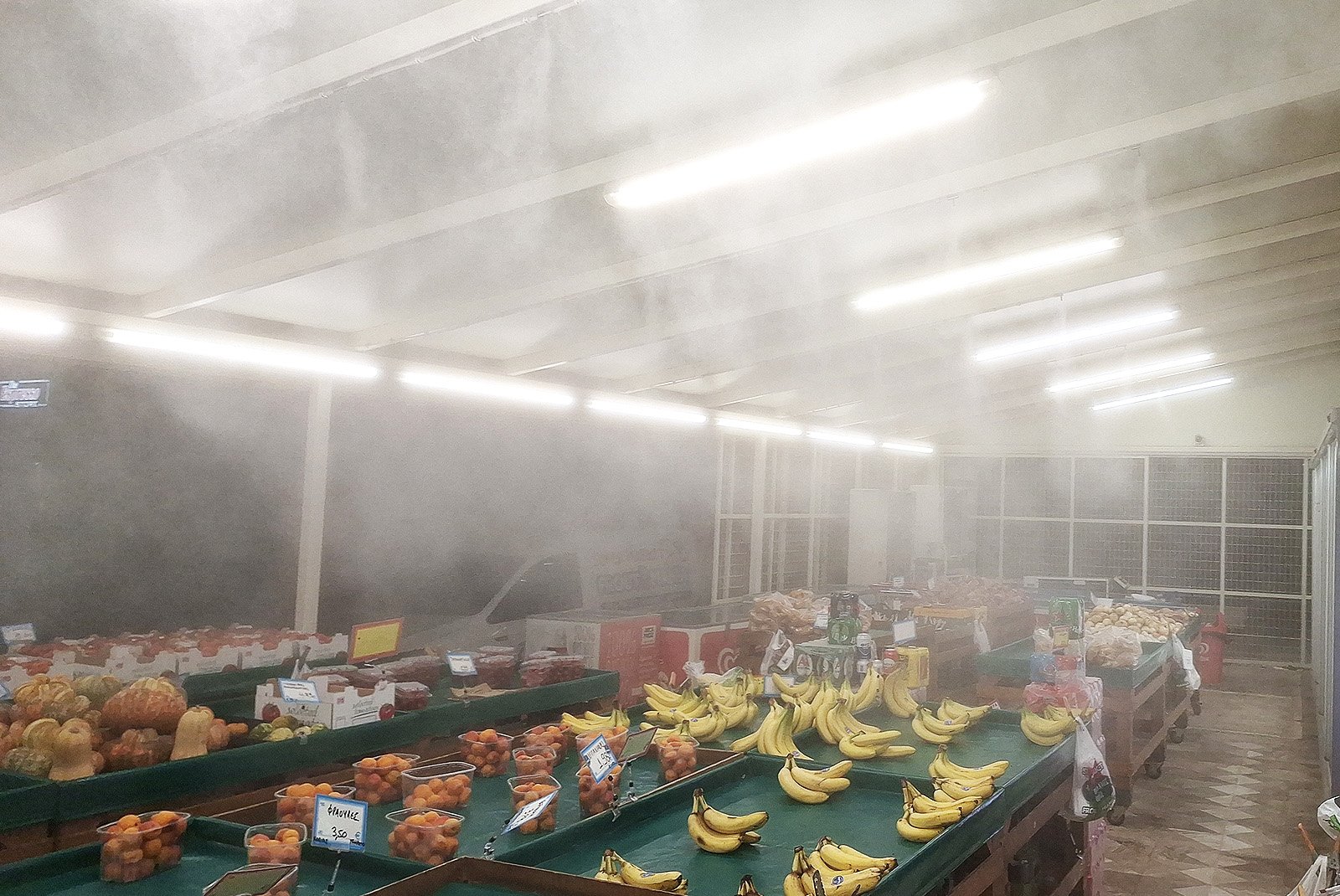 Τα φρέσκα φρούτα και λαχανικά έχουν υψηλή περιεκτικότητα σε νερό, γεγονός που τα καθιστά ιδιαίτερα ευαίσθητα στις συνθήκες του περιβάλλοντος. Όταν η υγρασία του αέρα είναι χαμηλή, η εξάτμιση επιταχύνεται και το προϊόν χάνει σταδιακά τη φρεσκάδα και τη ζωντάνια του. Η εφαρμογή συστήματος υδρονέφωσης / εκνέφωσης υψηλής πίεσης συμβάλλει στη διατήρηση της σωστής ισορροπίας υγρασίας στον χώρο, περιορίζοντας την απώλεια νερού και καθυστερώντας την αφυδάτωση. Παράλληλα, μέσω του φαινομένου της αδιαβατικής ψύξης, μειώνεται η θερμοκρασία του αέρα και δημιουργούνται πιο ήπιες συνθήκες για τα προϊόντα που εκτίθενται στους πάγκους.